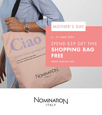 FREE SHOPPING BAG 25th March 2025 When you spend £59 on Nomination at Argento. T&Cs apply. Whilst stocks last.