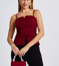 Quiz brings beautiful pieces to your holiday wardrobe that truly capture the spirit of celebration. The bottle green asymmetric tie belt midaxi dress makes a striking statement, as well as allowing for a customizable fit that flatters every figure. The dark red bow front top can be used for both casual gatherings and more formal occasions. Their faux red leather court heels also provide the finishing touch to any outfit, combining classic design with its trendy appeal.